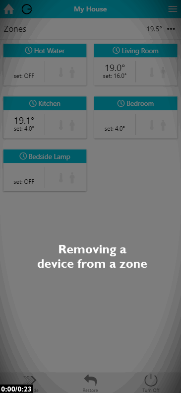This shows a list of devices assigned to the room. For example a radiator zone will have 1 or more Radiator Valves and likely a Room Sensor. These will be displayed in the list of devices, along with a button to remove the device.