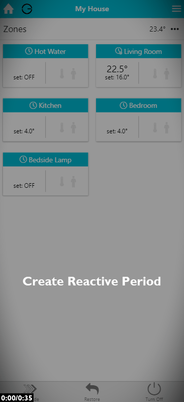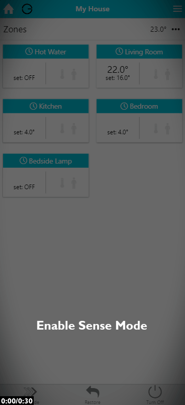 In Sense mode, you can set up a 7-day schedule to control the heating in this zone, in a similar manner to Timer mode. You set up a ‘heating period’ to suit your needs, including start time, end time, temperature, along with whether you want the period to switch on regardless or only when someone is in the zone.