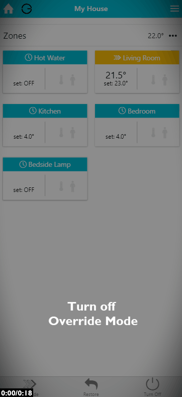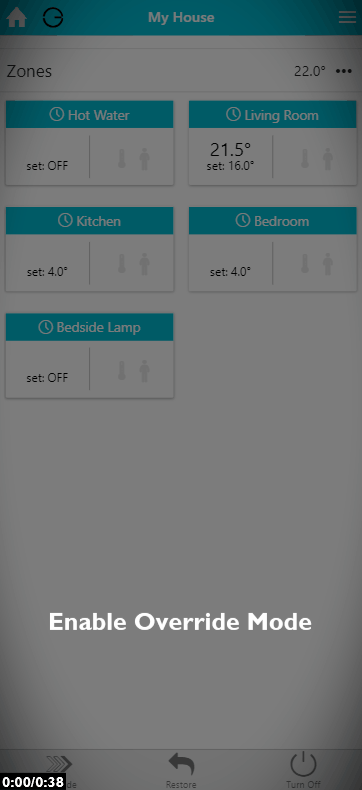 Override mode is used to temporarily modify the temperatures or on/off state of a zone. The system will automatically restore the previous mode and schedule once the Override has expired.